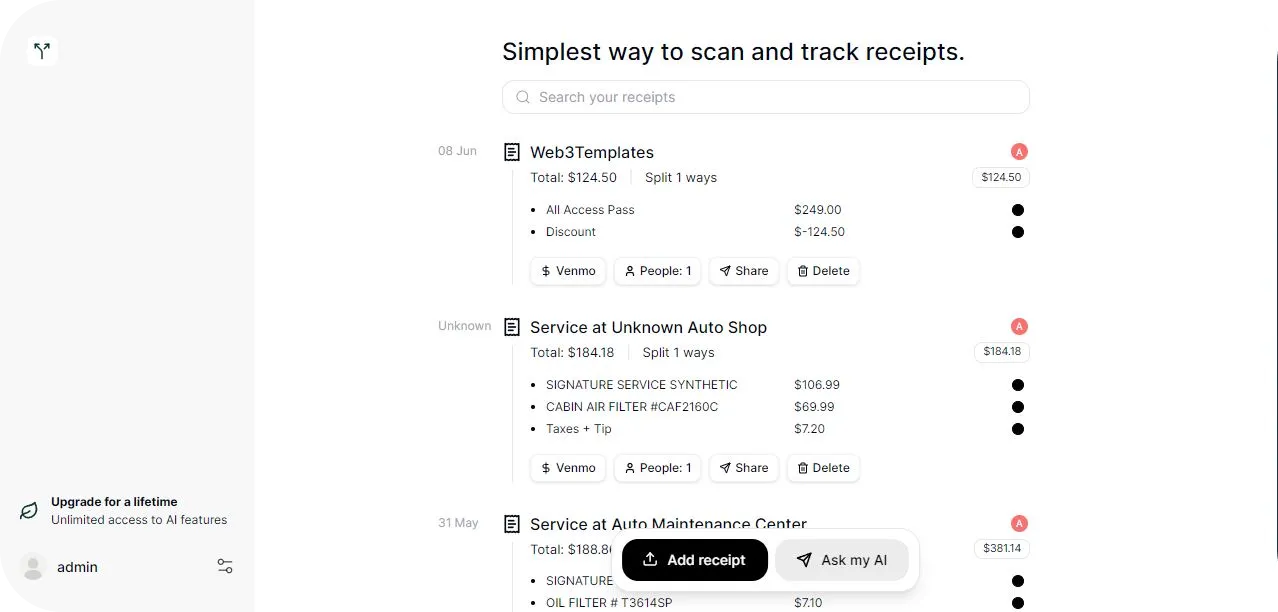 Scan, parse, and track receipts using advanced AI for real-time insights. Revolutionizes expense management with advanced AI ensuring all your business expenses are accurately managed and easily accessible.